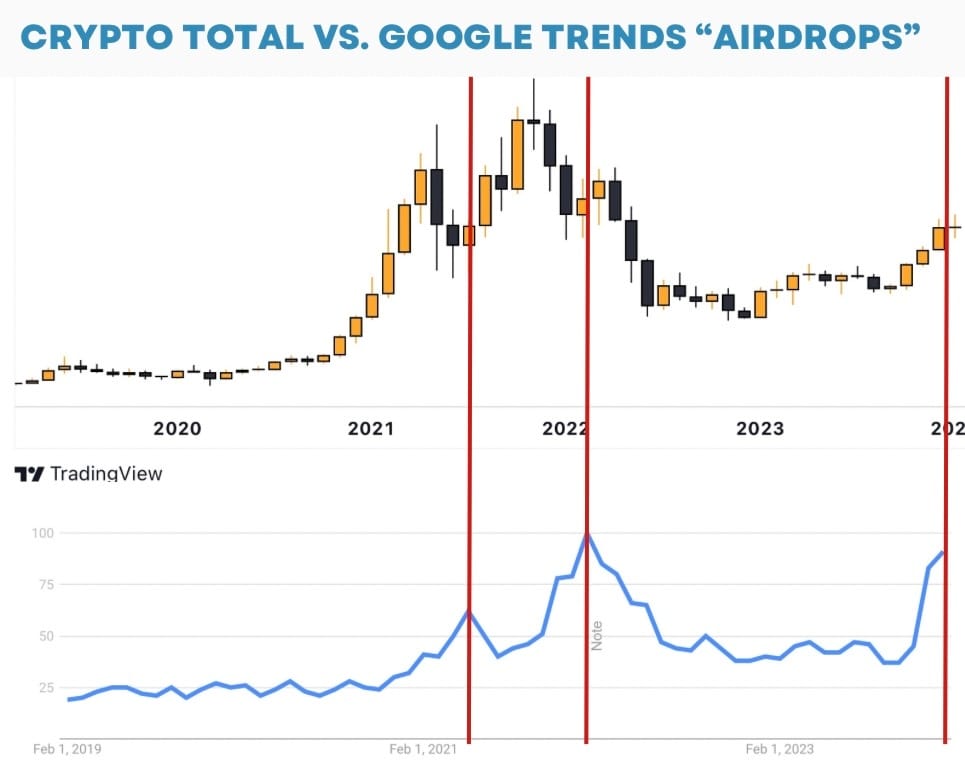 At the moment everyone and his mother is talking about airdrops. Compare this with google trend search and the chart of crypto total. This combination is an easy indicator that we are in the midst of a full blown bull market.